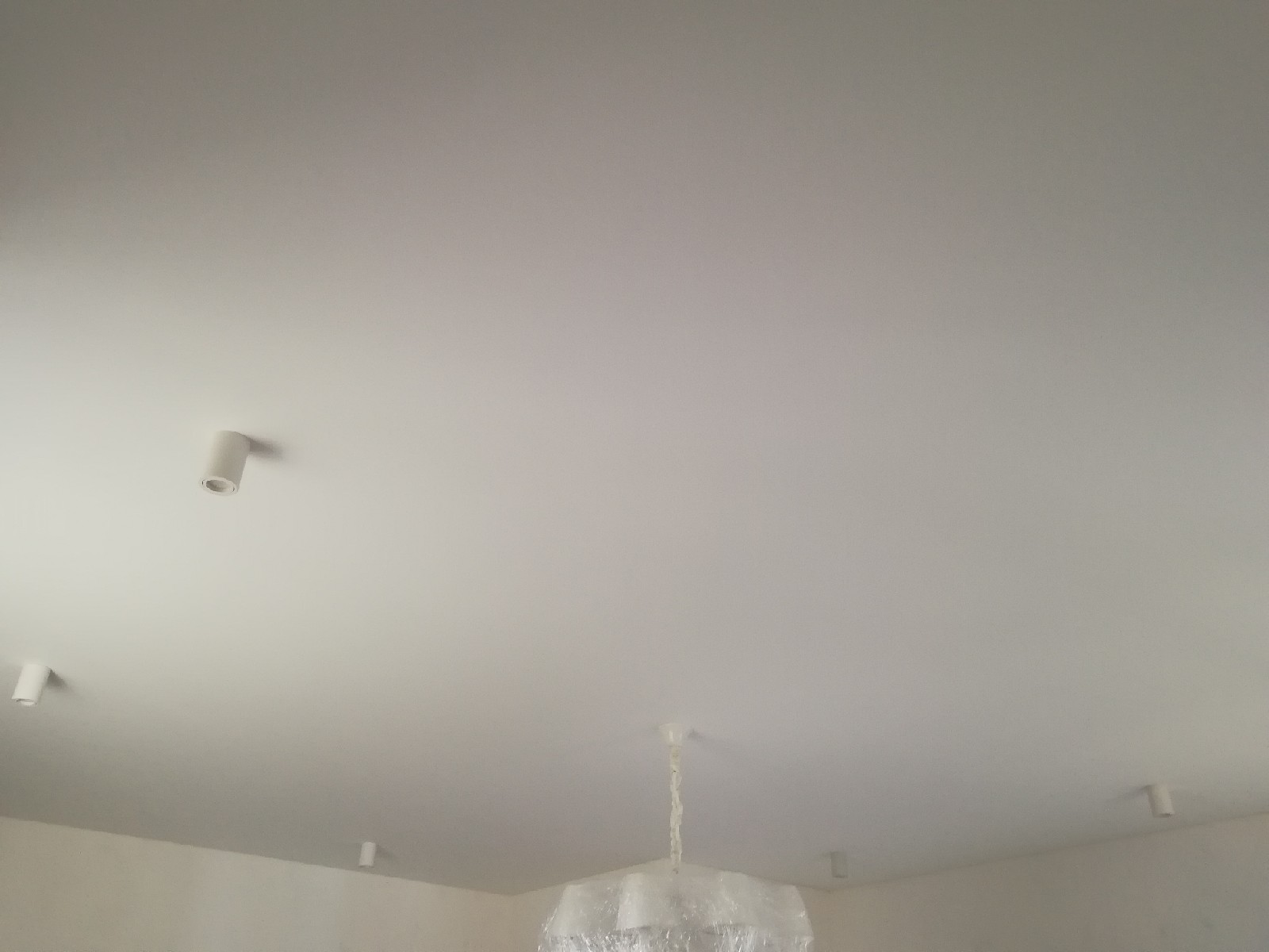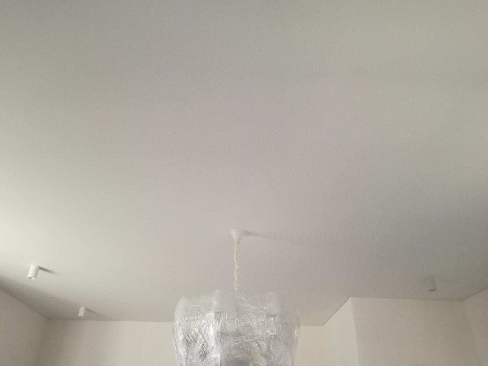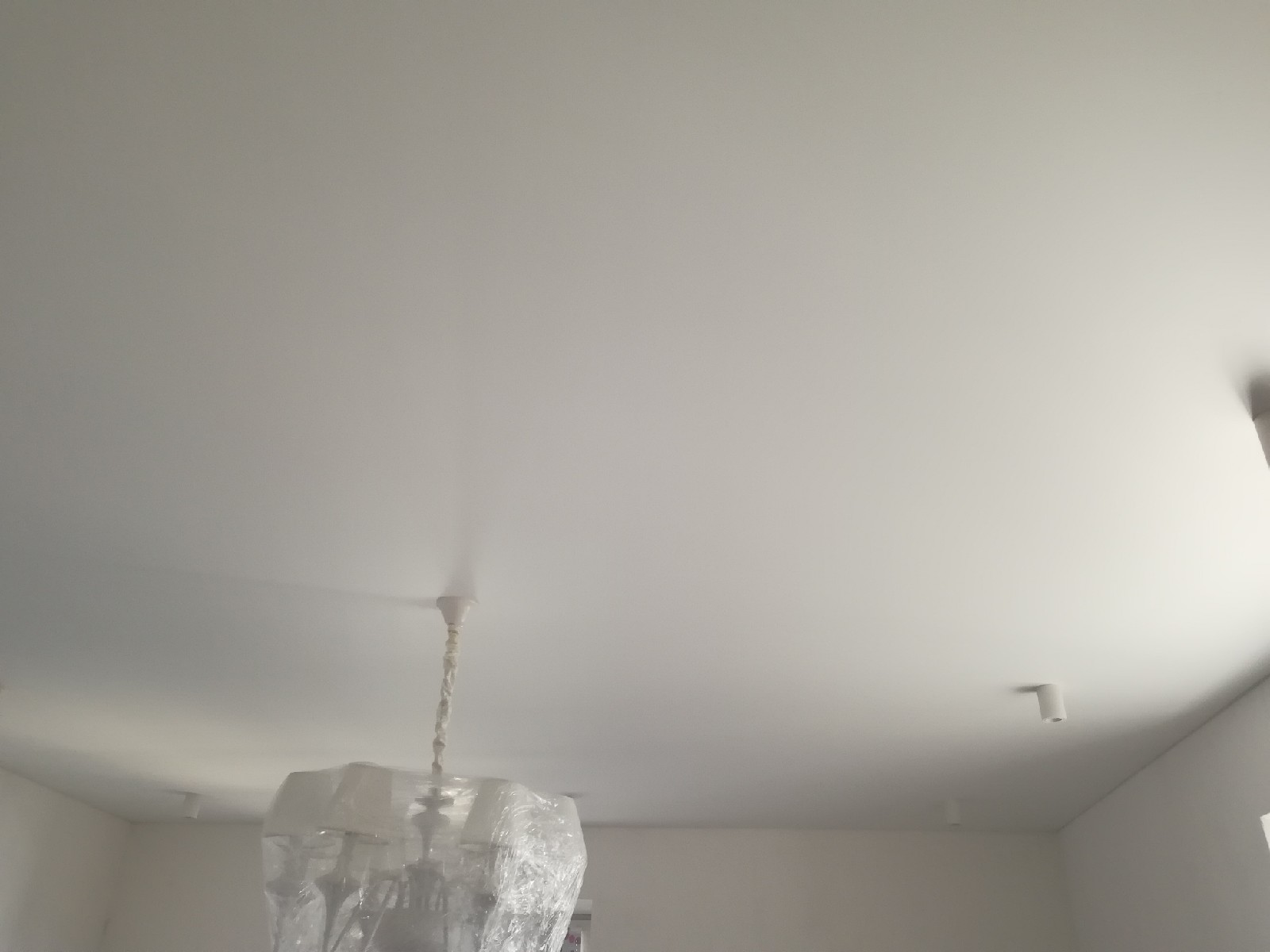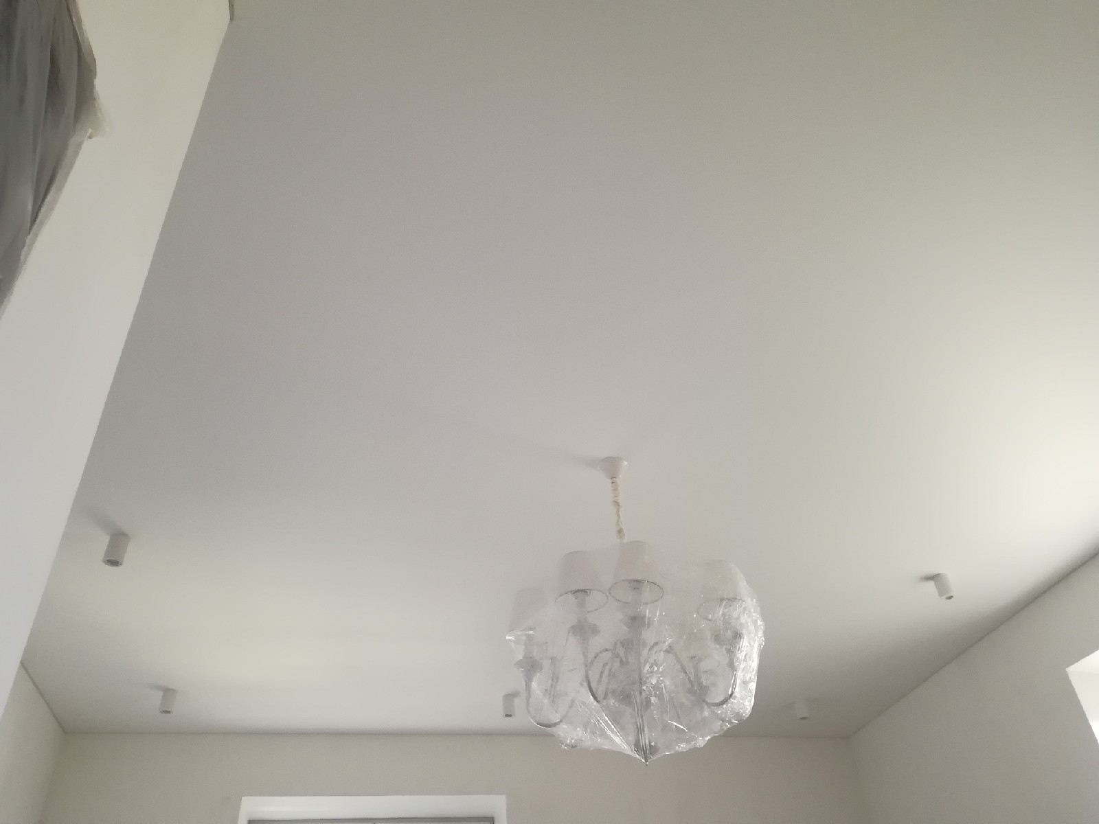 Стандартное полотно Cerutti Neve. Отделочные работы на данном этапе были еще не завершены, поэтому люстра находится в упаковочной плёнке. По периметру потолка будет приклеиваться декоративный багет. Полотно Cerutti Neve прочное, позволяет приклеивать багет и к потолку.