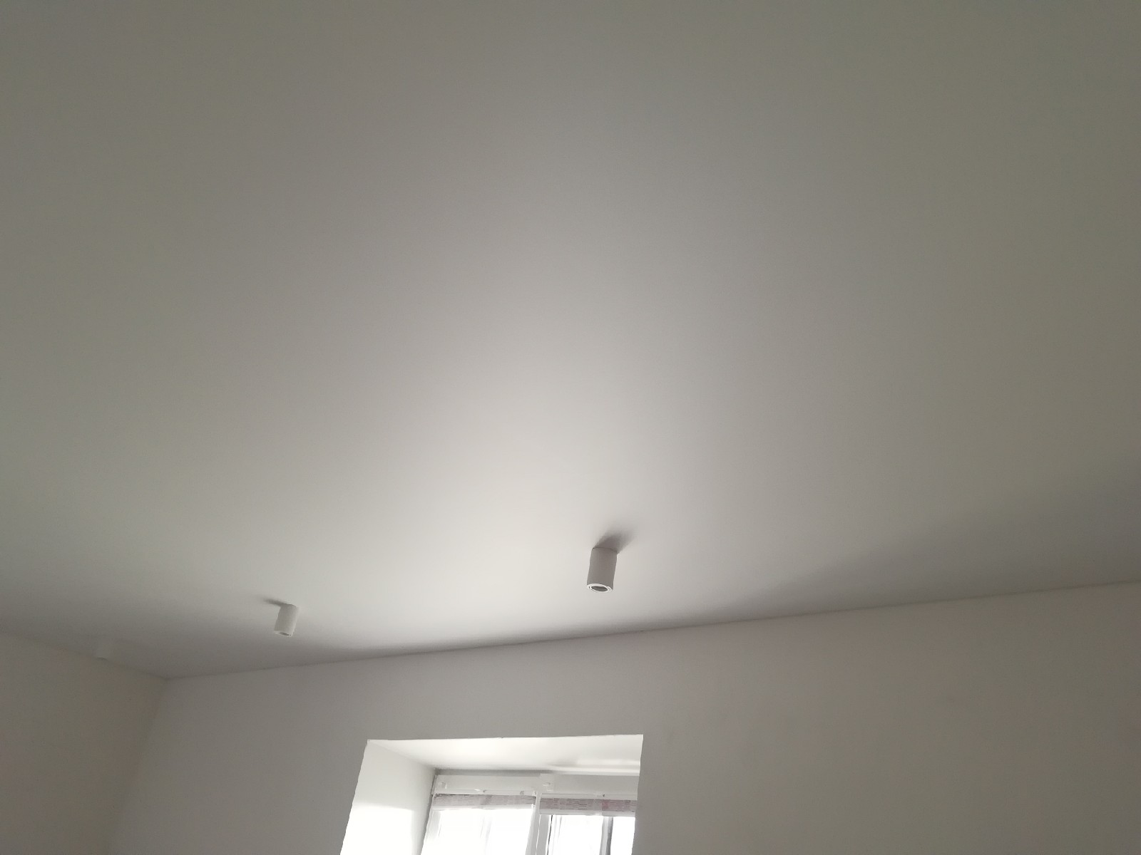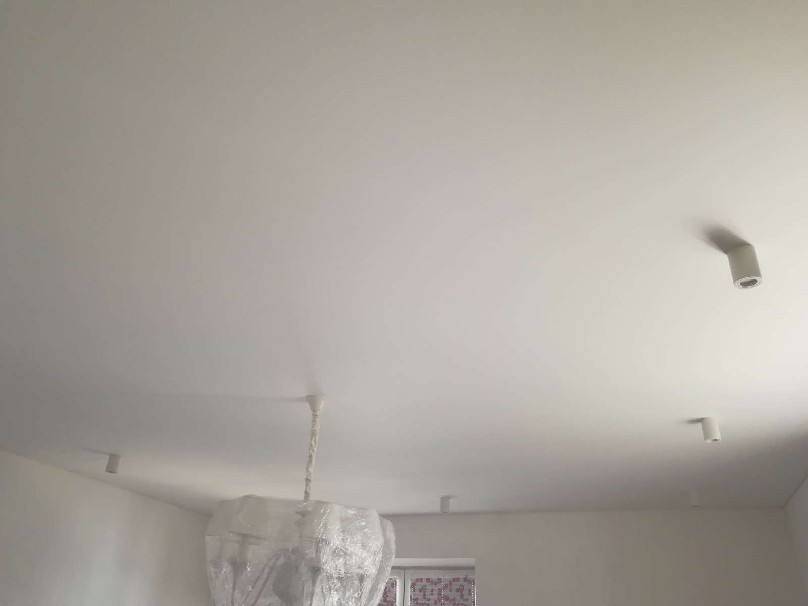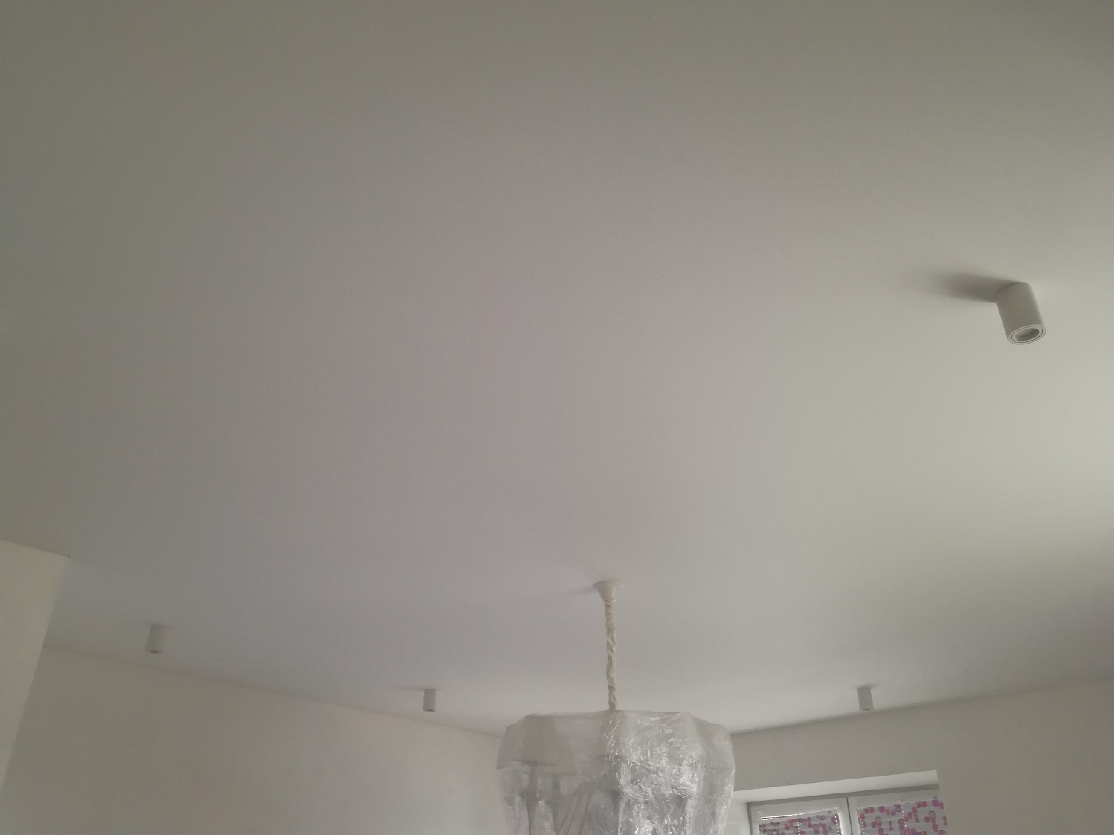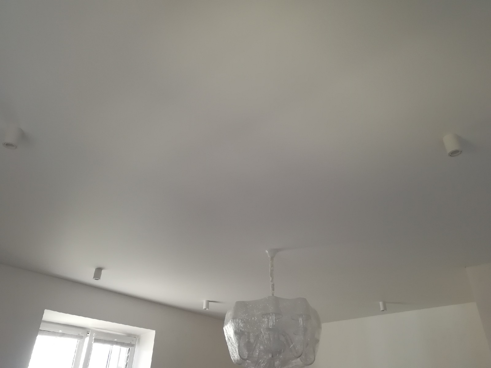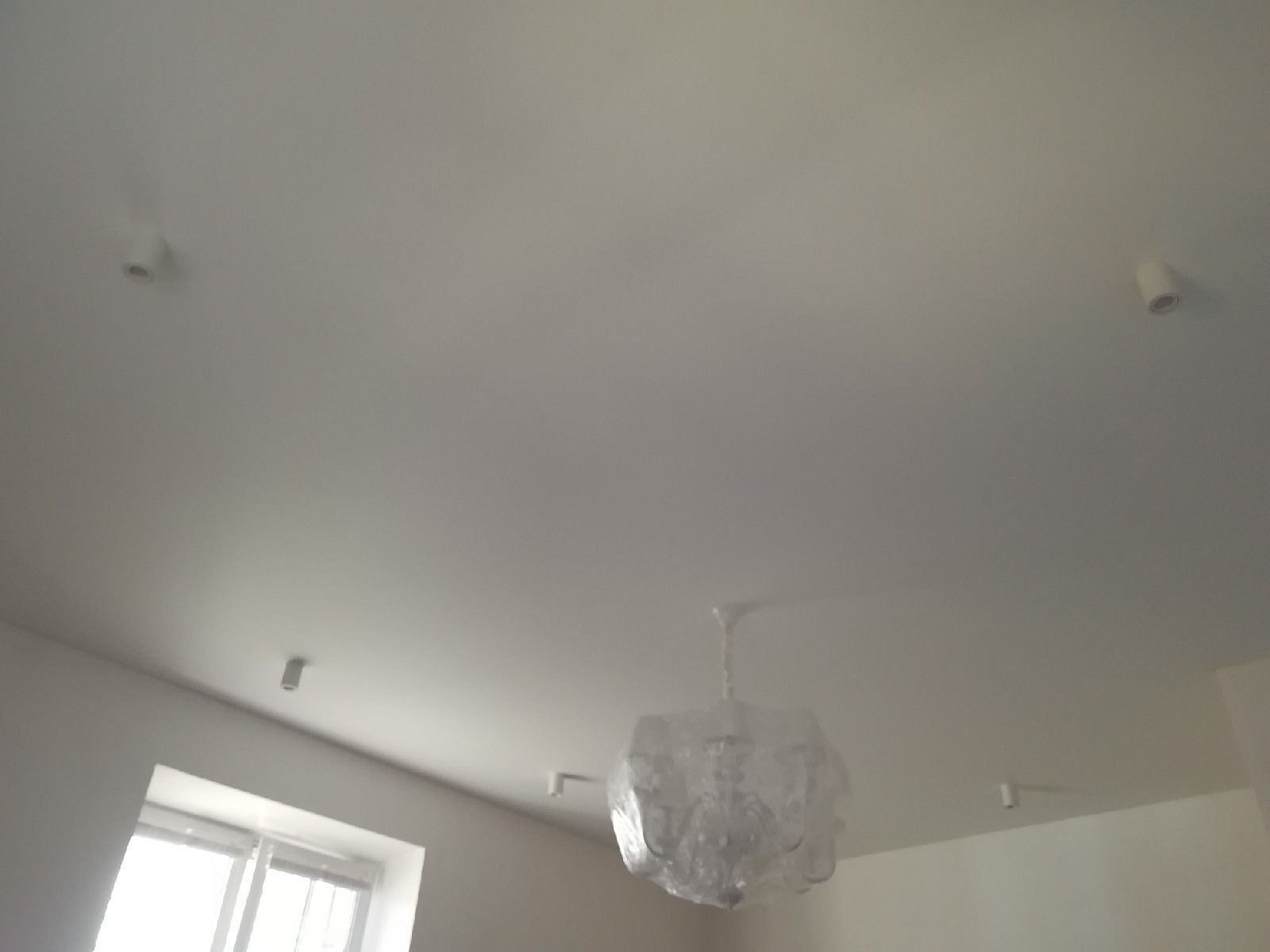 Стандартное полотно Cerutti Neve. Отделочные работы на данном этапе были еще не завершены, поэтому люстра находится в упаковочной плёнке. По периметру потолка будет приклеиваться декоративный багет. Полотно Cerutti Neve прочное, позволяет приклеивать багет и к потолку.