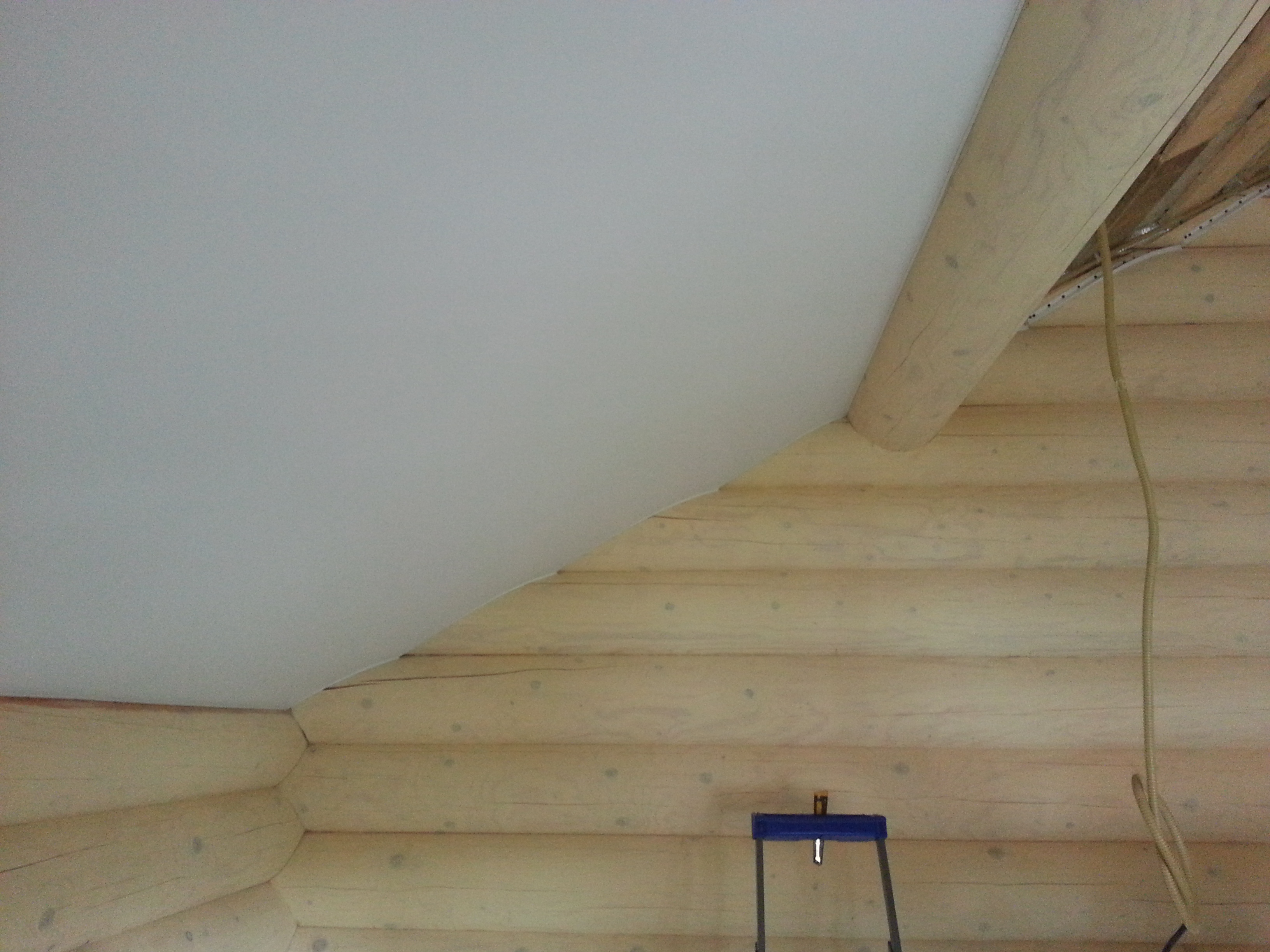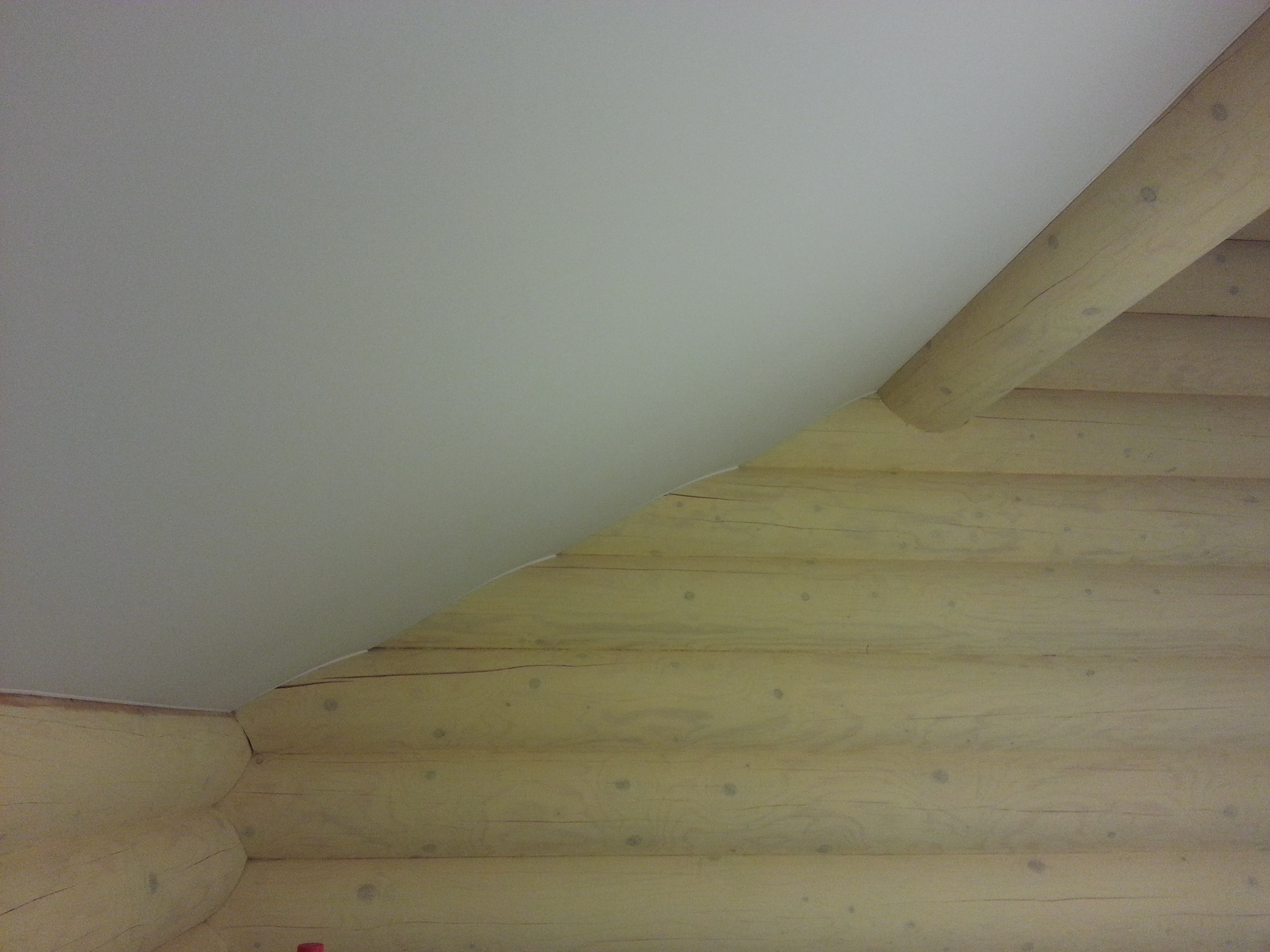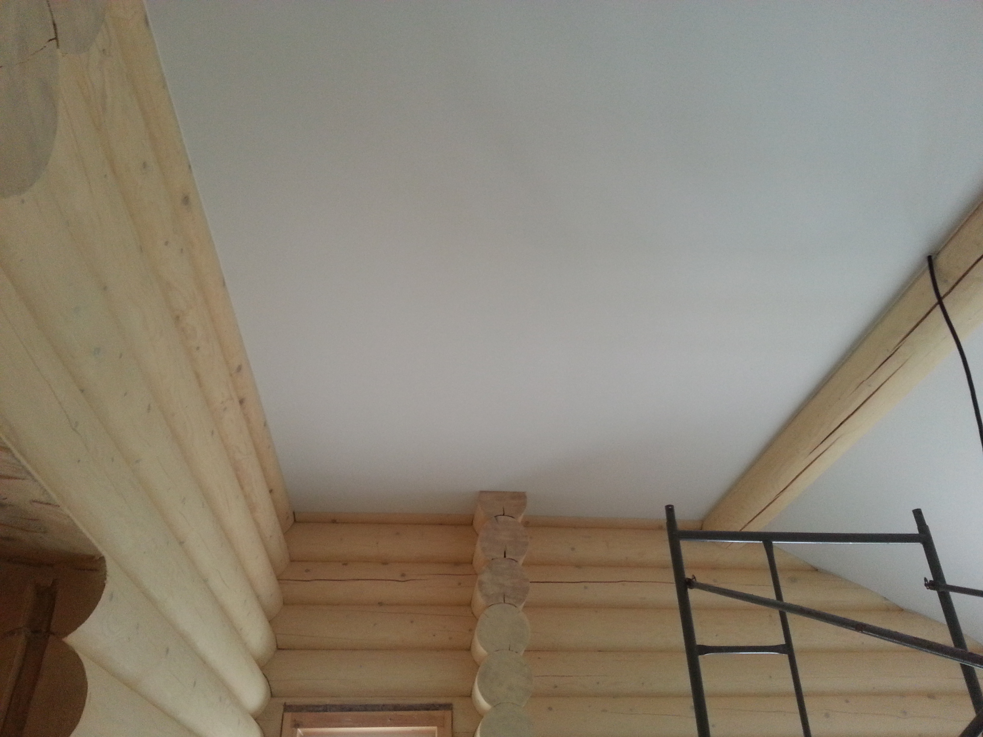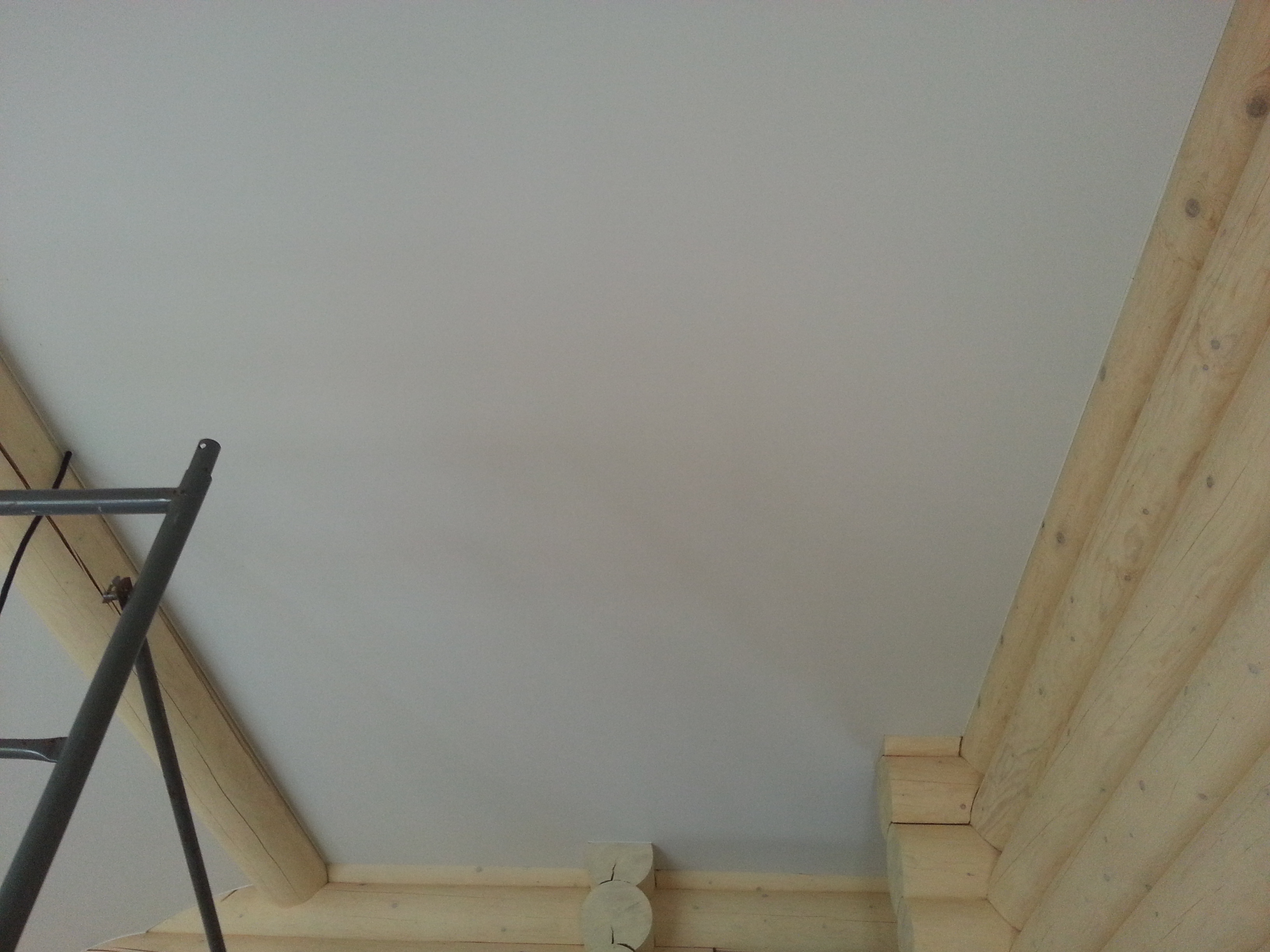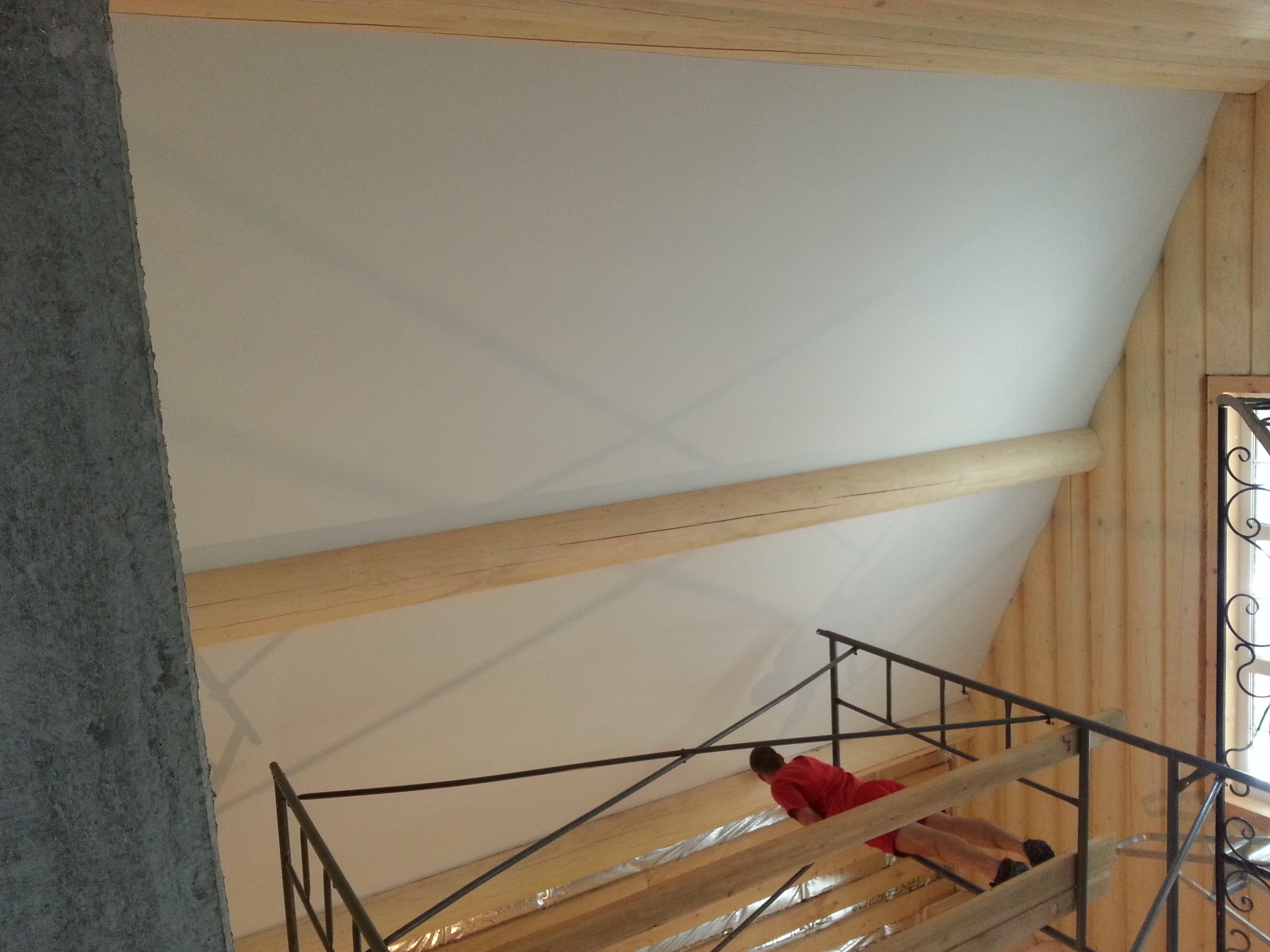 Сложный проект. Материал Attica Pro тоньше, чем стандартное полотно Neve, поэтому его можно установить в профиль "прищепку", который не требует установки декоративной вставки. Главным требованием заказчика было обойти бревна по наклонной плоскости плотно, без зазоров.
