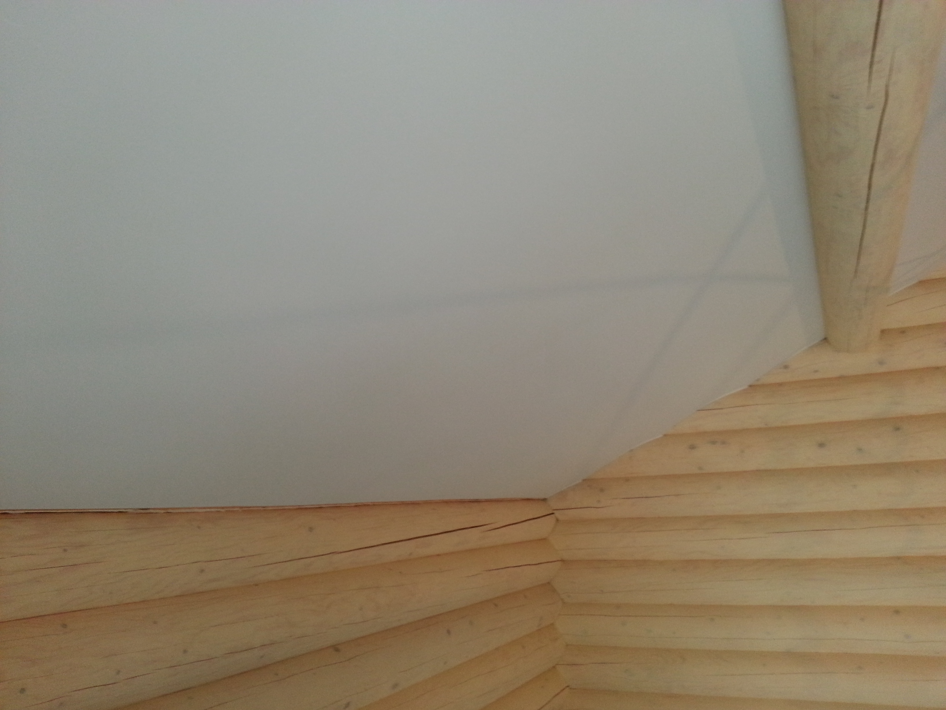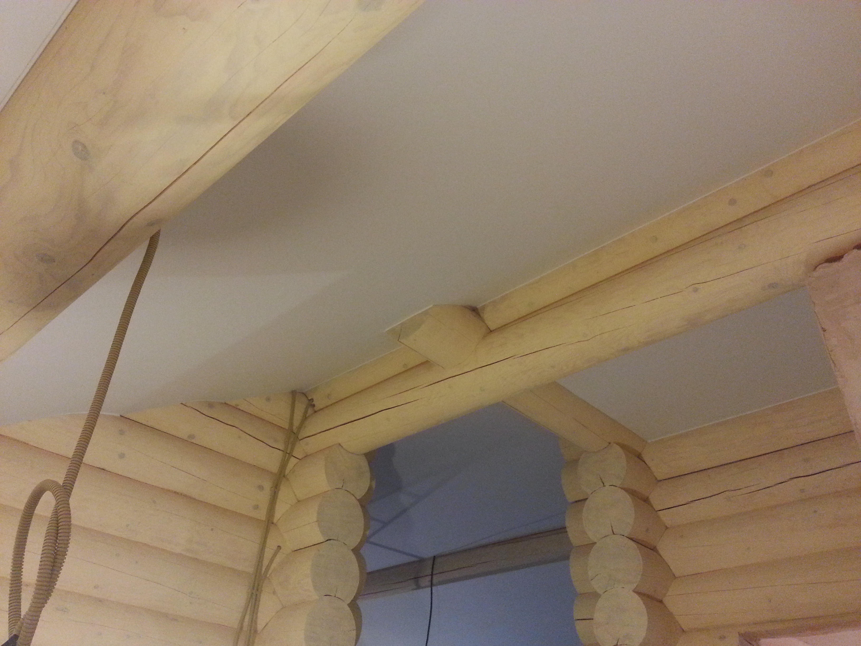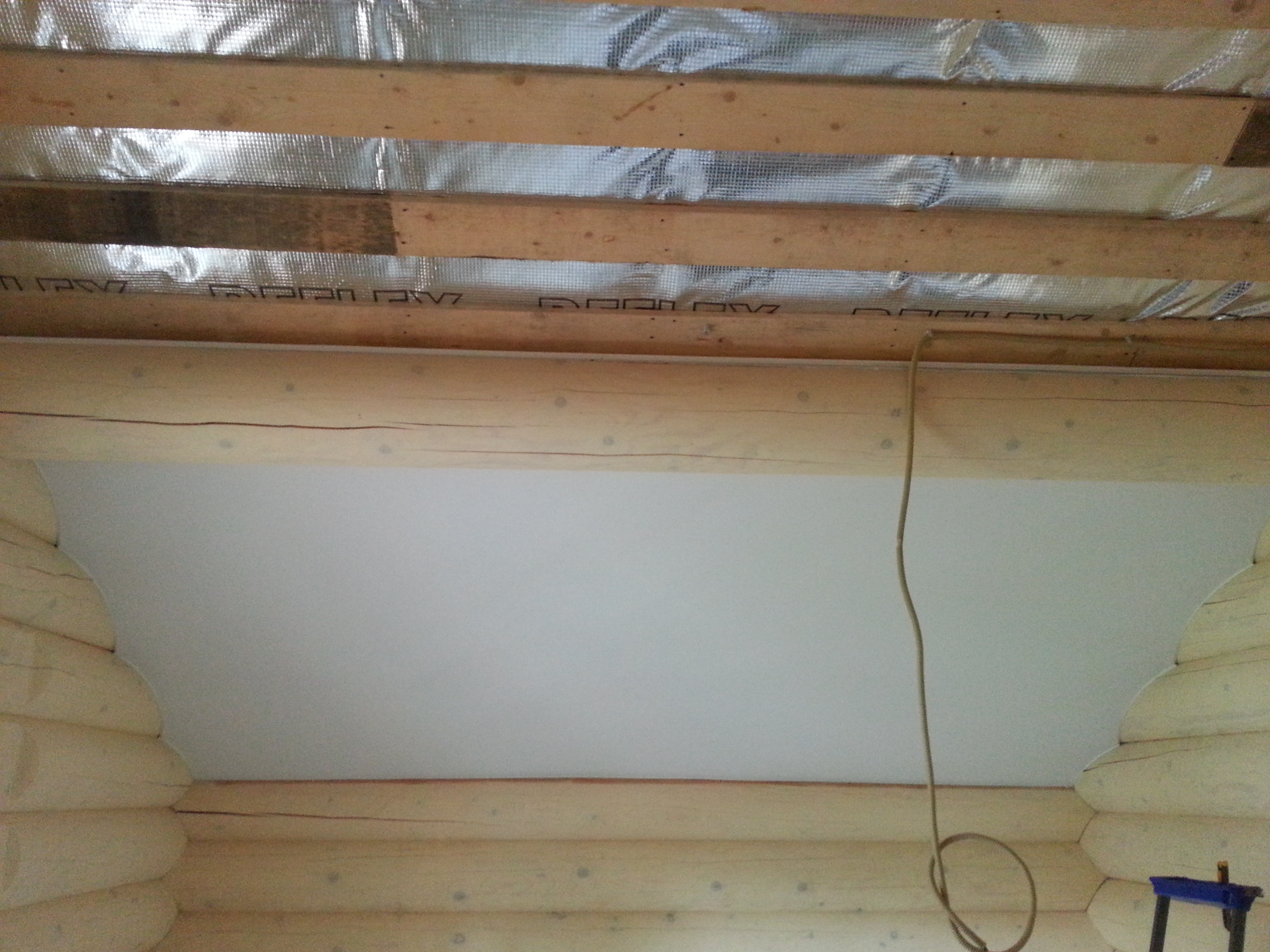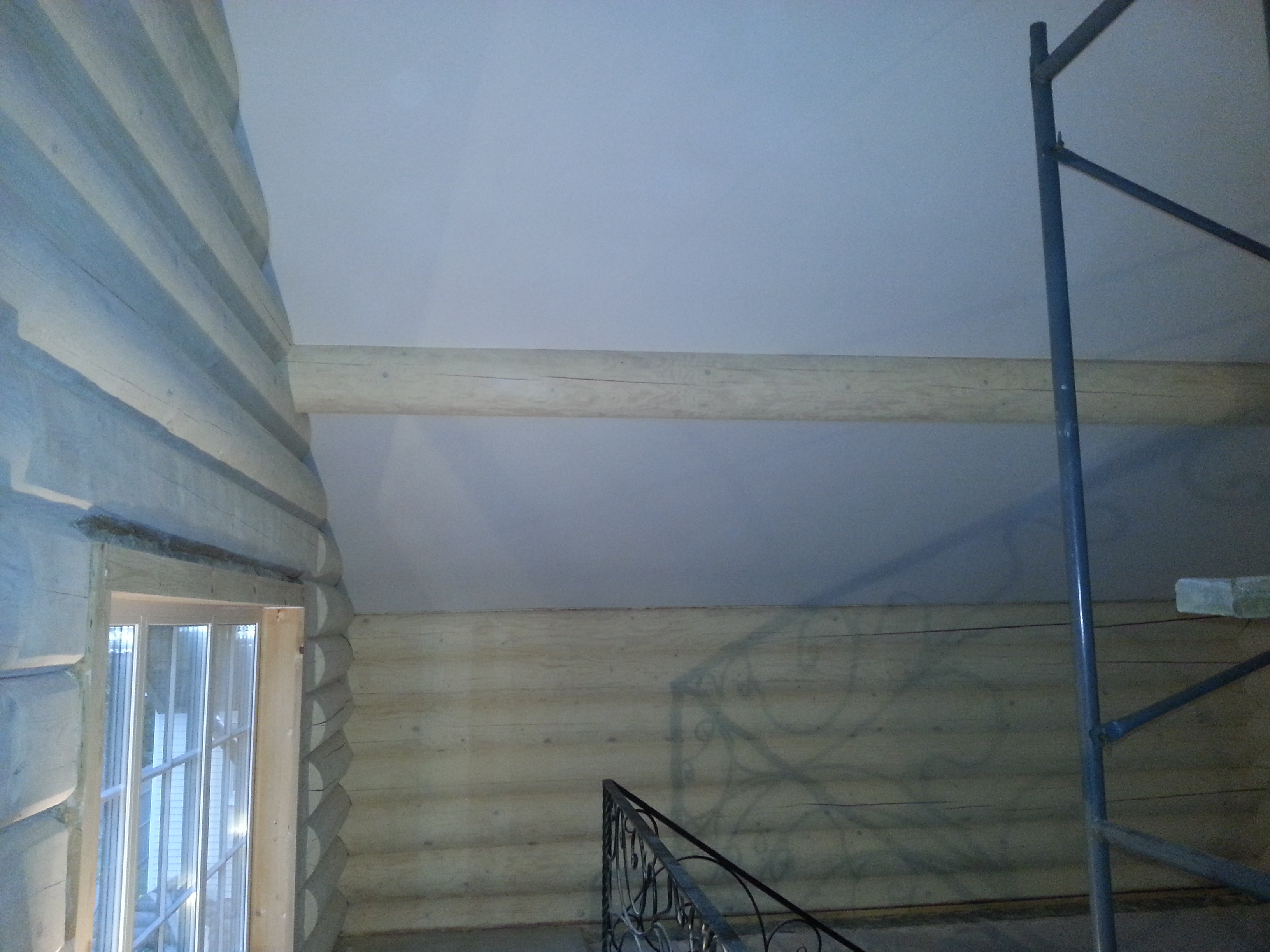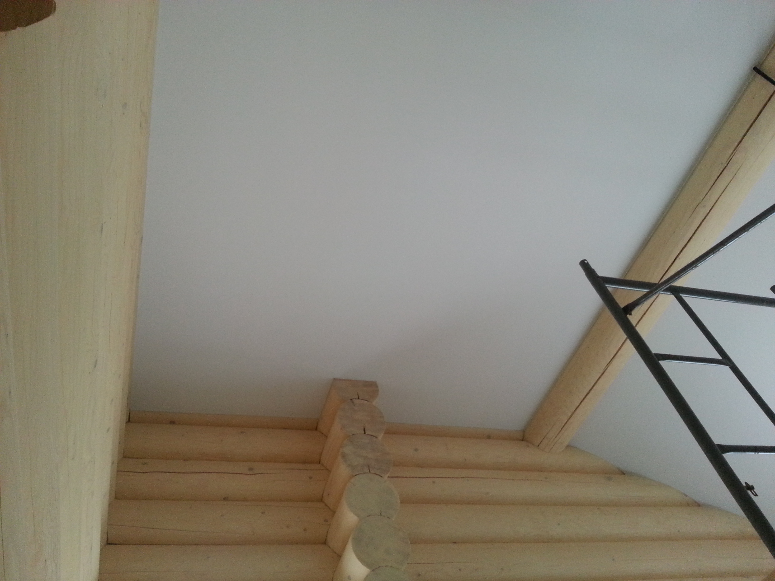Сложный проект. Материал Attica Pro тоньше, чем стандартное полотно Neve, поэтому его можно установить в профиль "прищепку", который не требует установки декоративной вставки. Главным требованием заказчика было обойти бревна по наклонной плоскости плотно, без зазоров.